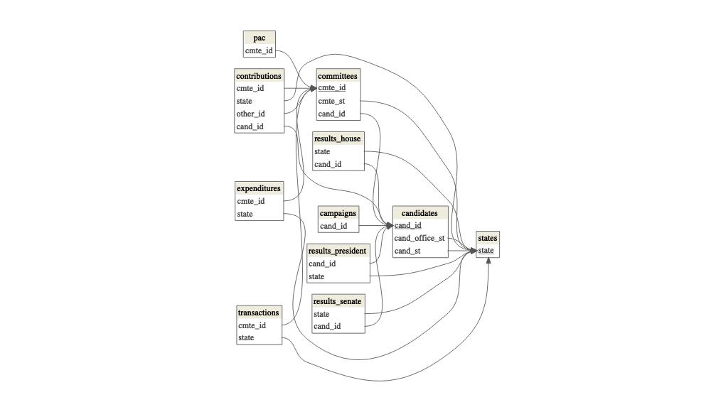 read_all_individuals() ~ 1.45GBread_all_contributions() ~ 15.4MBread_all_expenditures() ~ 52.1MBread_all_transactions() ~ 79.2MBThe headers of each table show the dataset name. The underlined variables are primary keys while all the others are foreign keys. The arrows show how the datasets are connected.