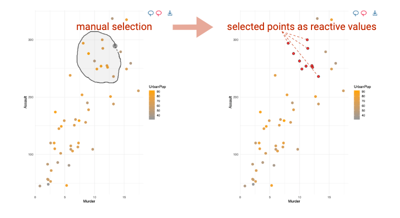 girafe(ggobj = gg_point)data_id) can be selected and manipulated on client and