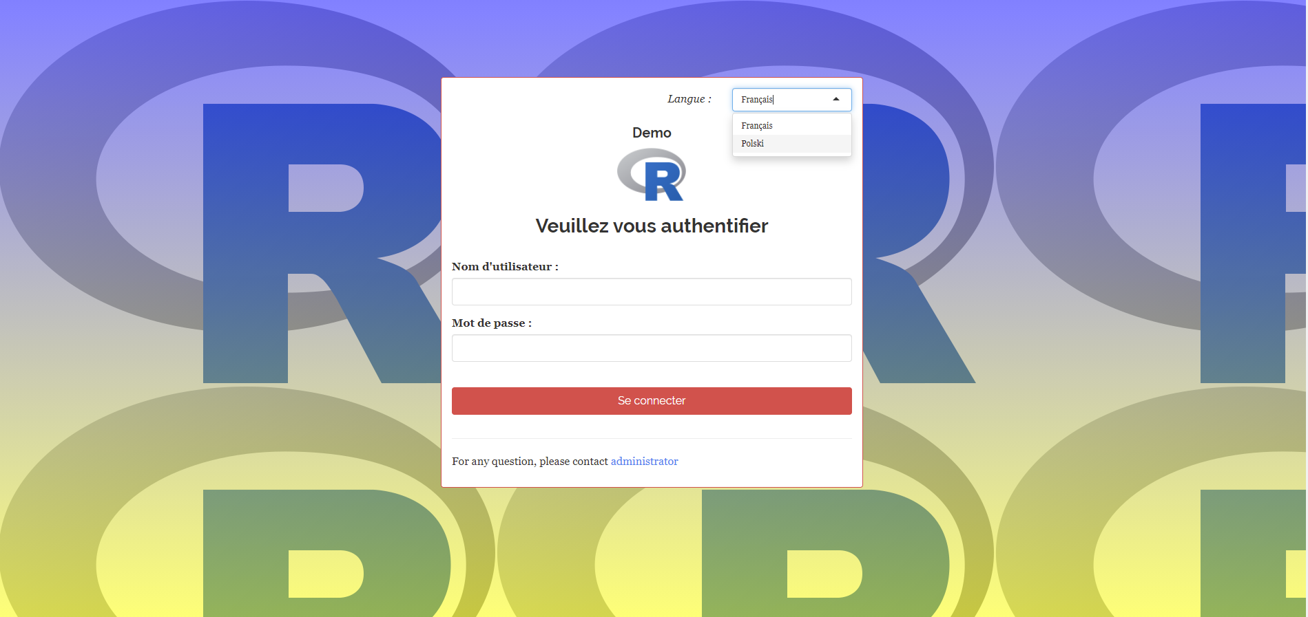 You can authenticate with: * user: shiny / password: shiny * user: shinymanager / password: shinymanager (Admin)